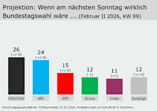 Wenn am nächsten Sonntag wirklich Bundestagswahl wäre, läge die CDU/CSU nach wie vor bei 26 Prozent, die AfD käme weiterhin auf 24 Prozent und die SPD auf 15 Prozent (alle unverändert). Die Grünen würden sich mit 12 Prozent (minus 1) leicht verschlechtern, die Linke würde etwas hinzugewinnen und 11 Prozent (plus 1) erzielen. Alle anderen Parteien bekämen zusammen 12 Prozent (unverändert), darunter keine Partei, die mindestens drei Prozent erzielen würde. Mit diesem Ergebnis hätte Schwarz-Rot nach wie vor keine parlamentarische Mehrheit.
