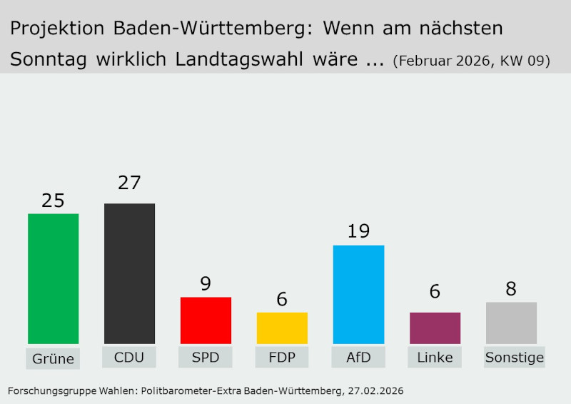 Wenn schon am nächsten Sonntag Landtagswahl wäre, dann ergäben sich folgende Projektionswerte für die Parteien: Die Grünen lägen zurzeit bei 25 Prozent, die CDU käme auf 27 Prozent, die SPD auf 9 Prozent, die FDP auf 6 Prozent, die AfD auf 19 Prozent und die Linke auf 6 Prozent. Die anderen Parteien erhielten zusammen 8 Prozent, darunter keine Partei, die mindestens drei Prozent erzielen würde. Aufgrund dieser Zahlen würde es für eine Regierung aus CDU und Grünen reichen.