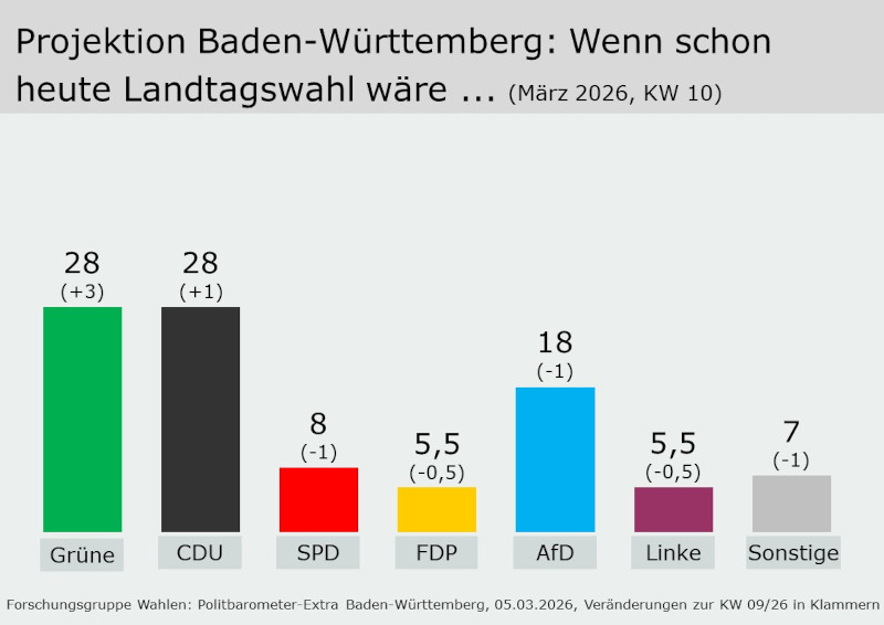 Die Umfrage zu diesem Politbarometer-Extra wurde wie immer von der Mannheimer Forschungsgruppe Wahlen durchgeführt. Die Interviews wurden am 4. und 5. März 2026 unter 1.069 zufällig ausgewählten Wahlberechtigten in Baden-Württemberg telefonisch und online erhoben. Die Befragung ist repräsentativ für die dortige wahlberechtigte Bevölkerung. Der Fehlerbereich beträgt bei einem Anteilswert von 40 Prozent gut +/- drei Prozentpunkte und bei einem Anteilswert von 10 Prozent gut +/- zwei Prozentpunkte. Das nächste Politbarometer-Extra zur Landtagswahl in Rheinland-Pfalz sendet das ZDF am Freitag, den 13.3.2026. Informationen zur Methodik der Umfrage