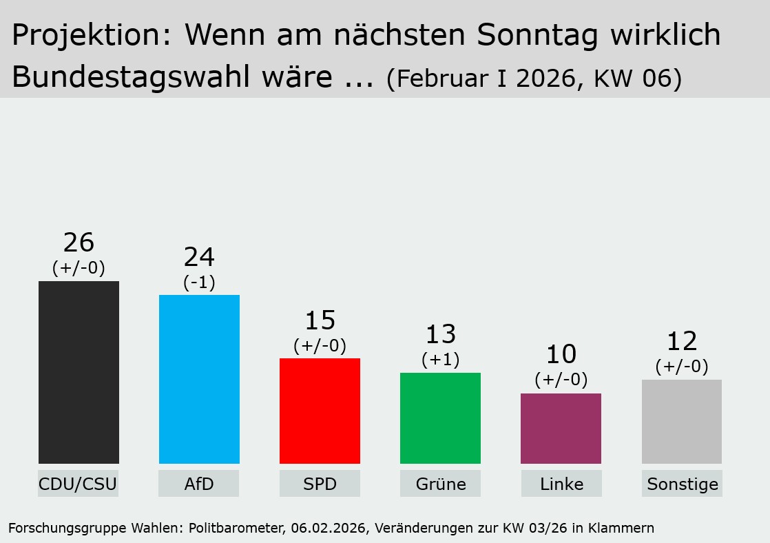 Wenn am nächsten Sonntag wirklich Bundestagswahl wäre, läge die CDU/CSU unverändert bei 26 Prozent, die AfD hätte leichte Verluste und käme auf 24 Prozent (minus 1). Die SPD bliebe bei 15 Prozent (unverändert), die Grünen würden sich auf 13 Prozent (plus 1) verbessern und die Linke würde erneut 10 Prozent (unverändert) erreichen. Alle anderen Parteien bekämen zusammen 12 Prozent (unverändert), darunter keine Partei, die mindestens drei Prozent erzielen würde. Mit diesem Ergebnis hätte Schwarz-Rot nach wie vor keine parlamentarische Mehrheit.